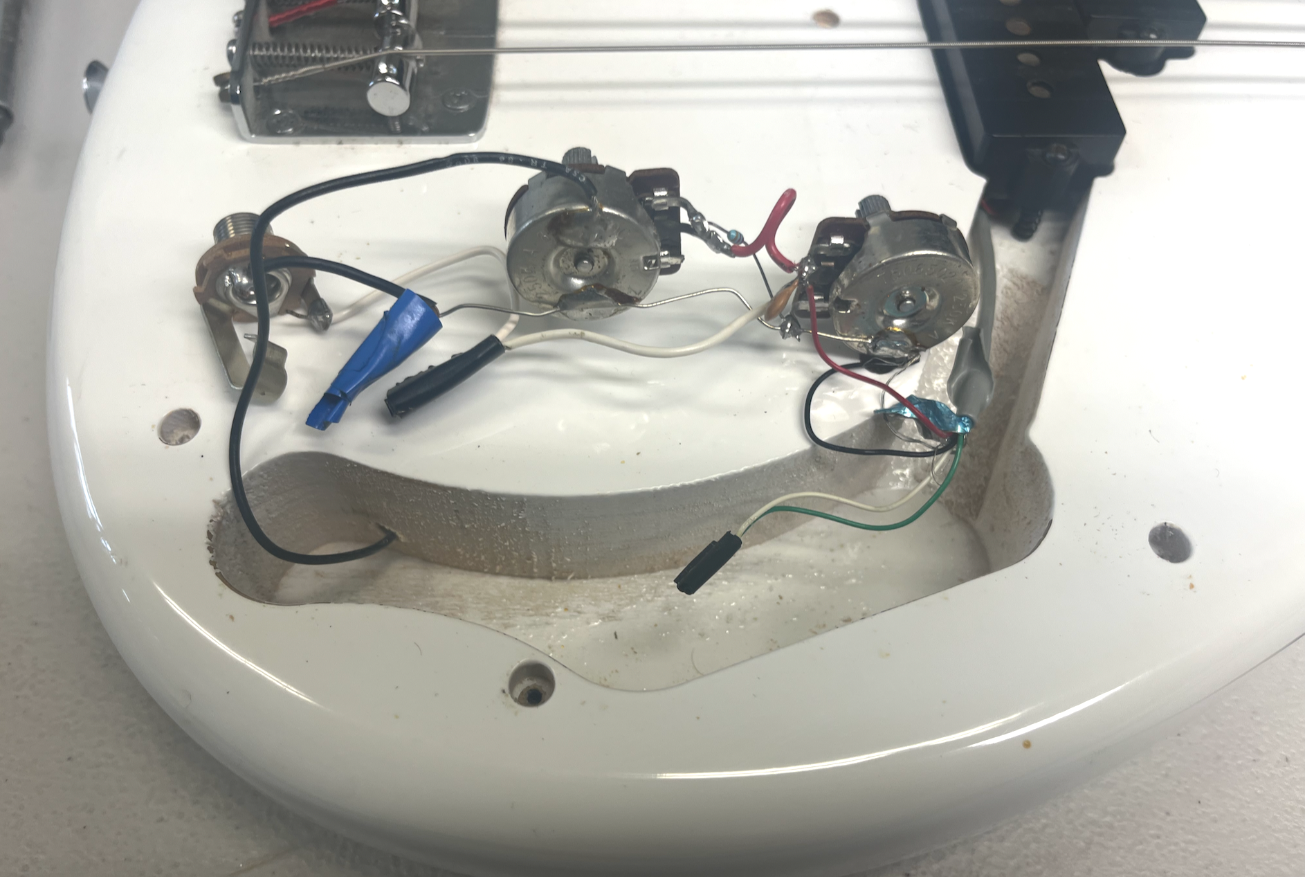 I decided to try my hand at playing the bass, but the one I had at home had a lot of noise, so I picked up the rewiring project my dad had been meaning to do. I replaced the potentiometers and capacitor, and made sure to keep the soldering cleaner than the previous version. I somehow forgot to take a video of what it sounded like before, but here's what the inside looked like when I started:
