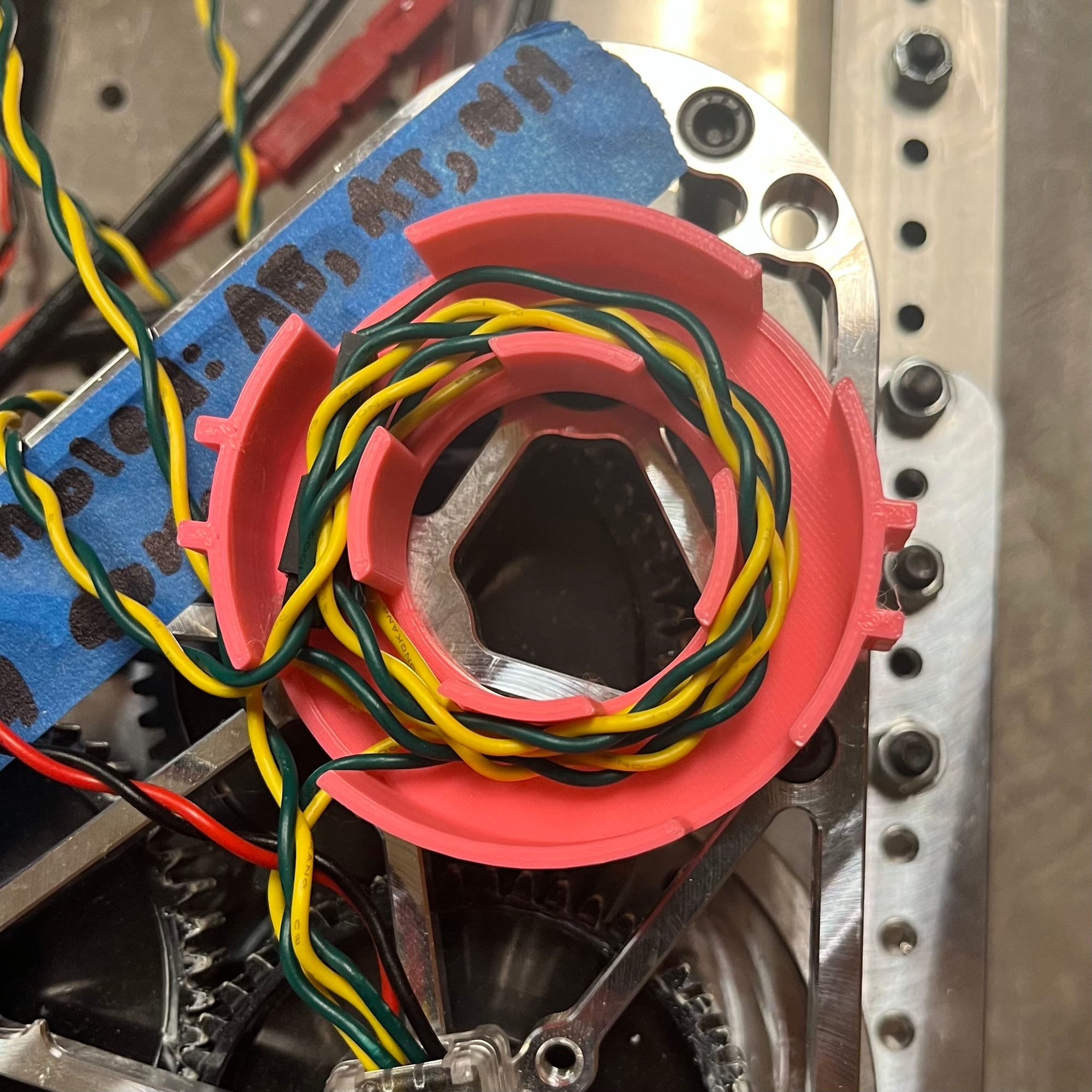 I used OnShape to CAD this 3D printed cable management system for CAN bus wires on our FRC drivetrain. These disks reduce slack, as well as protecting the wires from the swerve modules.