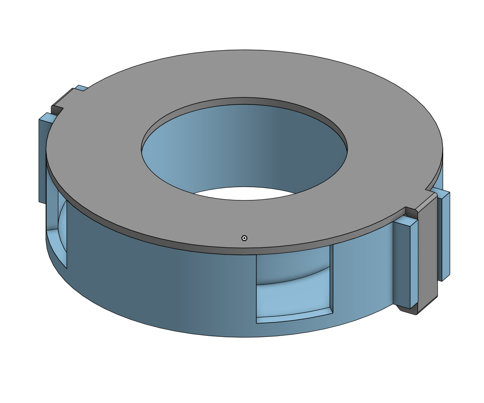 The biggest challenges in this design were the size constraints, as well as getting the tabs on the cover to flex enough to clamp onto the main body, without shattering the plastic. In terms of size, the disks had to be small enough to fit on top of our swerve modules and generally be convenient in terms of belly pan space efficiency, but they also had to fit our wire connectors, which are rectangular and do not curve.