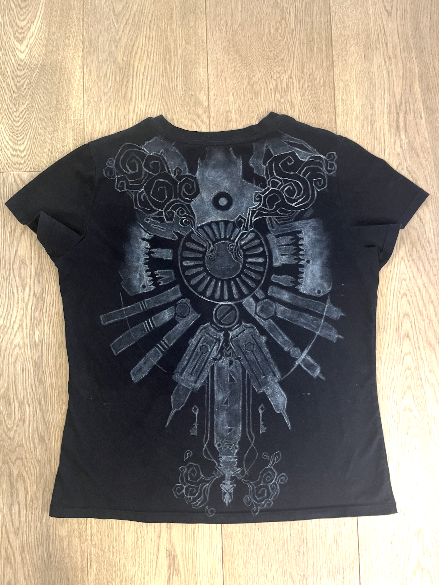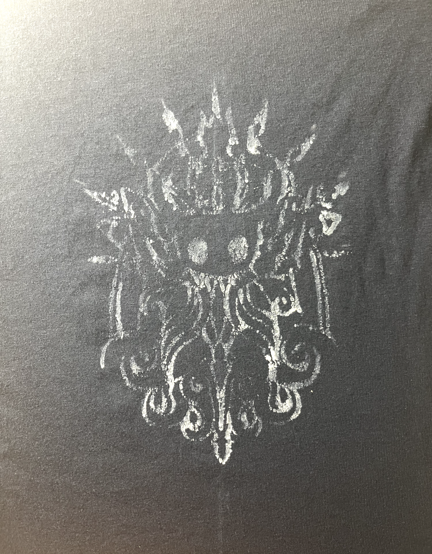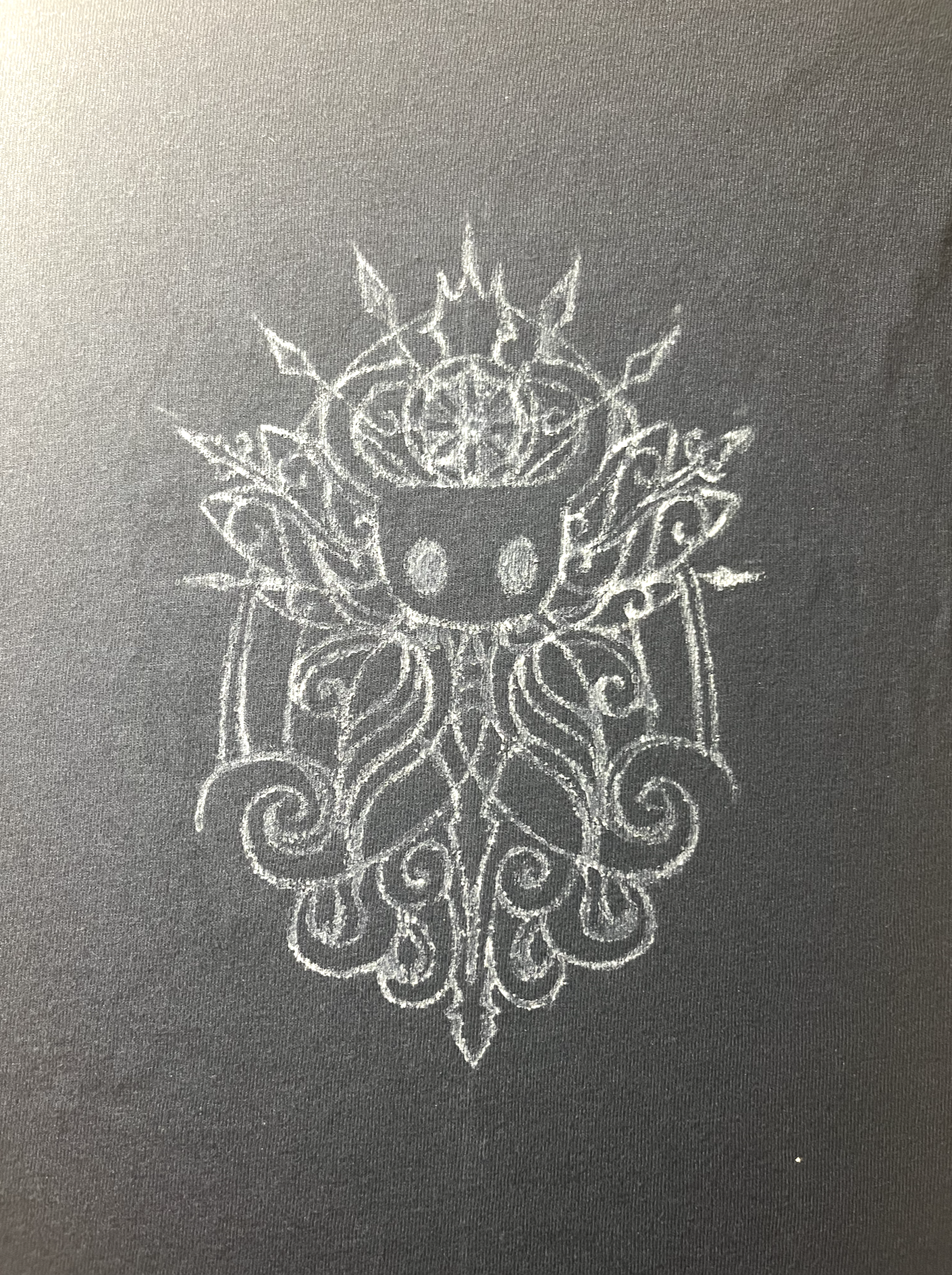I used an inverted screen printing technique to paint a Hollow Knight shirt for my brother (the one on the right), and then fully hand painted an Arcane design on a shirt for myself (left), because after completing my custom tote project, I realized I could use fabric paint to put pretty much anything I wanted on a shirt.