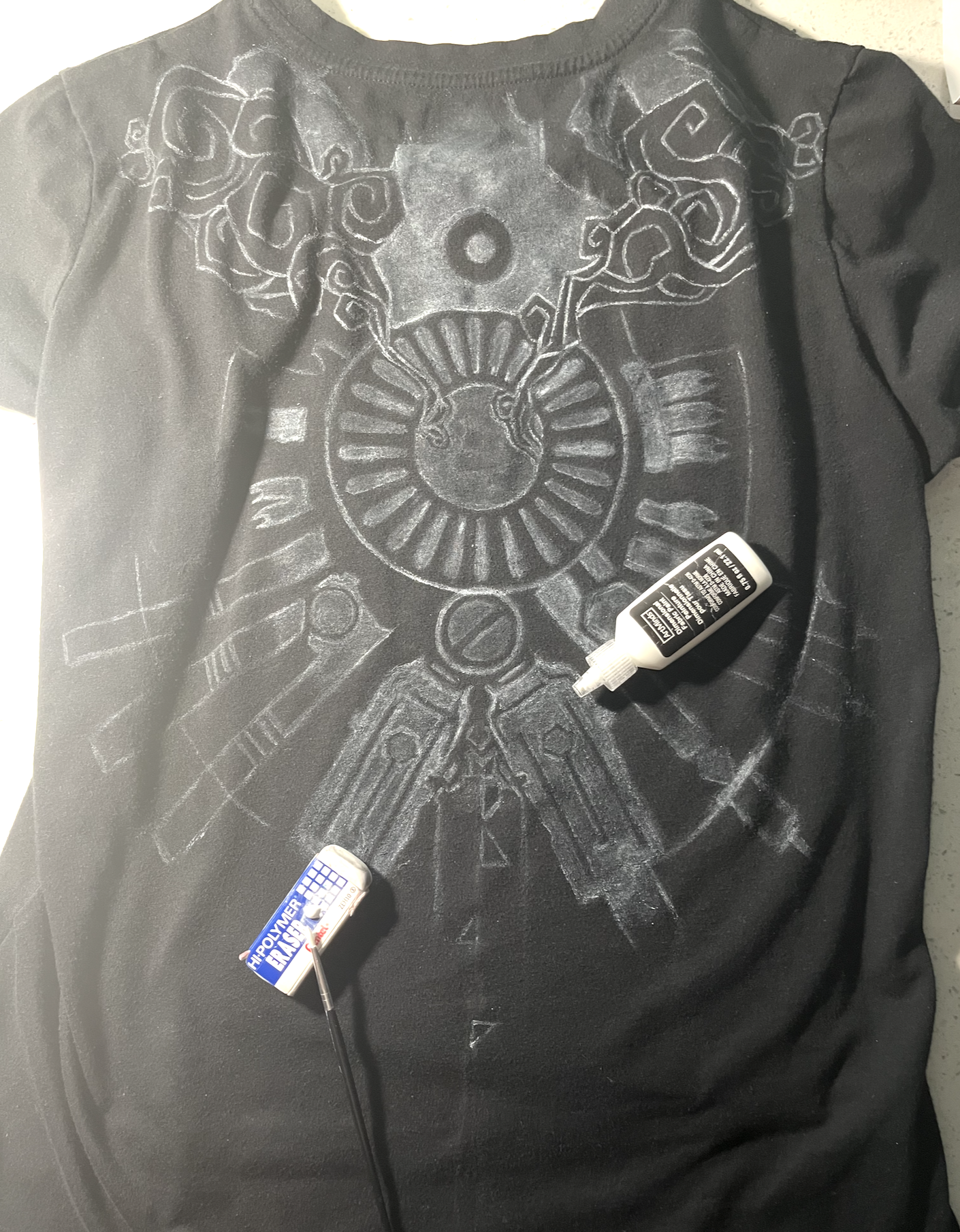 I saw a video of someone using fabric markers to draw Vi's back tattoo design (from Arcane) on a hoodie, and knew I had to try it. The Hollow Knight project showed me that it was actually pretty easy to just fabric paint on a shirt, so instead of trying to fight a stencil again I decided to just freehand it. I didn't do a lot of planning out the proportions, I just went section by section and roughly outlined with a fabric pencil and then painted over it— in hindsight this was probably not the safest bet, but I'm glad it worked. I'm not super happy with how uneven the pigment is in some of the filled in areas (the paint was not very opaque), but I'm still proud of how the design turned out.