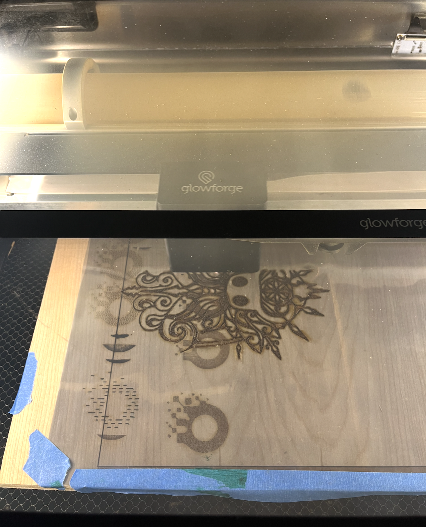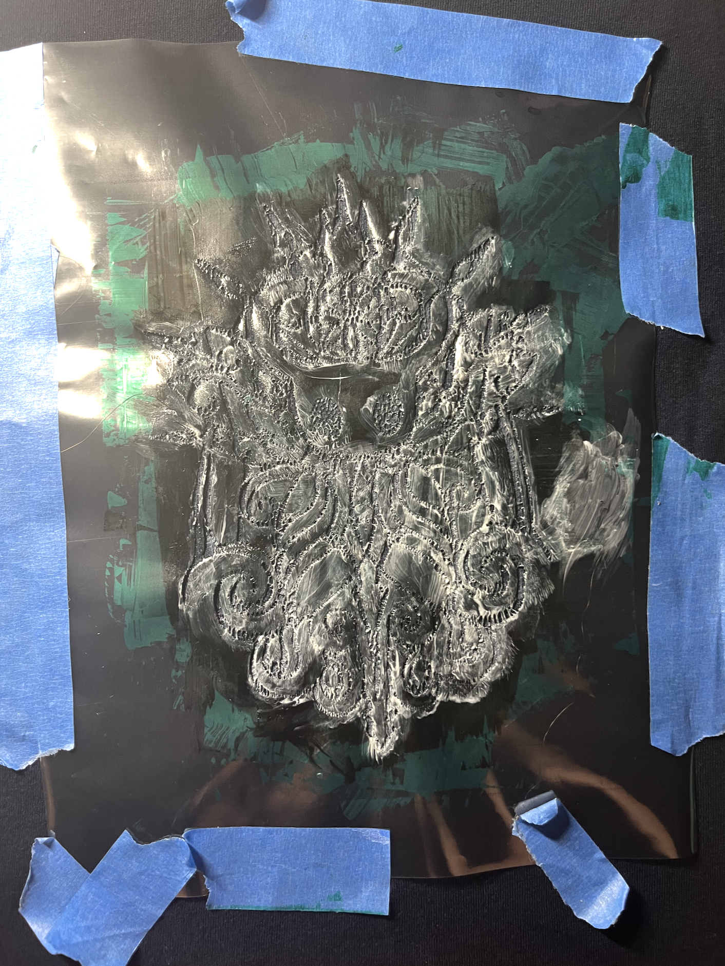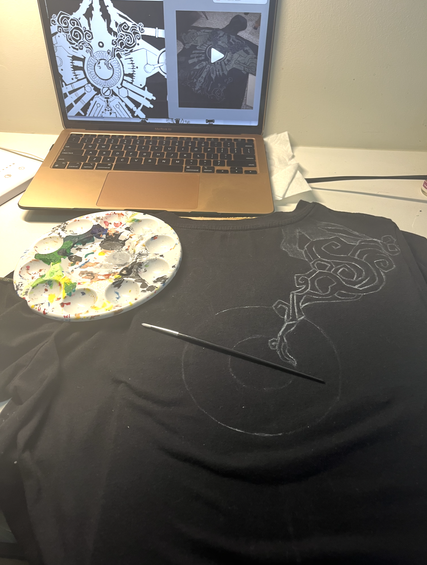 The design I was copying was too complicated to use a normal stencil, but I found a technique online that would still allow me to laser cut some form of stencil, but without all of the pieces falling out. The technique was essentially the inverse of screen printing, where instead of putting a stencil over mesh, you just cut mesh holes only where the open parts of the stencil would be. This took a lot of trial and error with the laser cutter settings, but eventually I ended up with a piece of plastic that would allow paint to pass through in the specific areas of the design. I then used this plastic to transfer paint onto the shirt (the picture in the top right). I wasn't able to get a super clean transfer (bottom left), but it was enough to make it pretty easy to clean up the details with a paintbrush (bottom right).