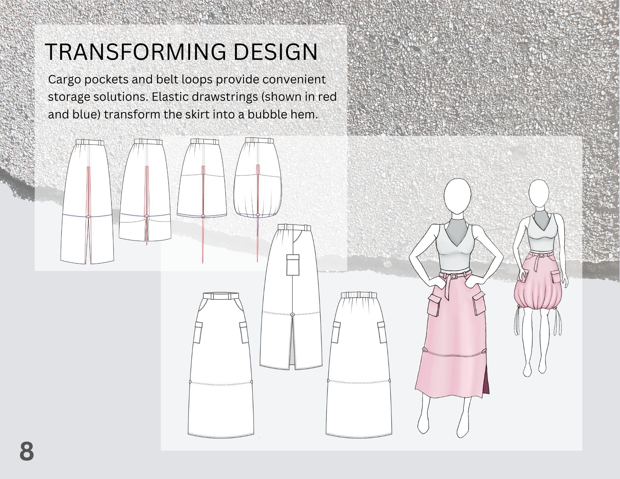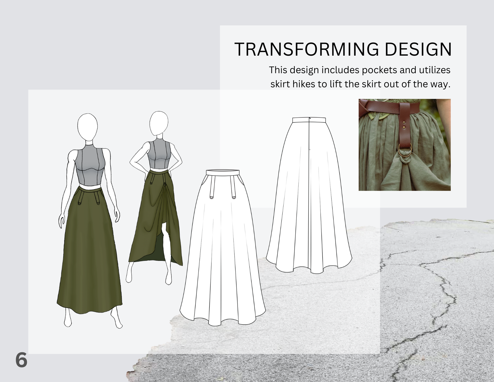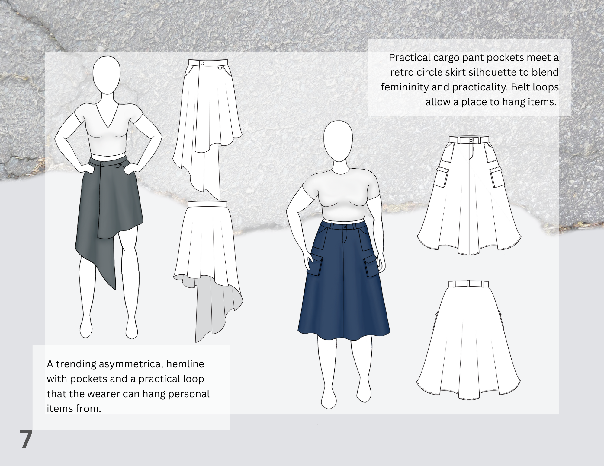 My collection name is Functional Femininity, and my main focus was blending practical, traditionally masculine, elements with the feminine garment that is the skirt. I wear a lot of skirts in my day to day life, and am often frustrated with their lack of mobility and storage options. I applied my passion for engineering to create transforming designs, and made sure to add loops and pockets for essential storage.