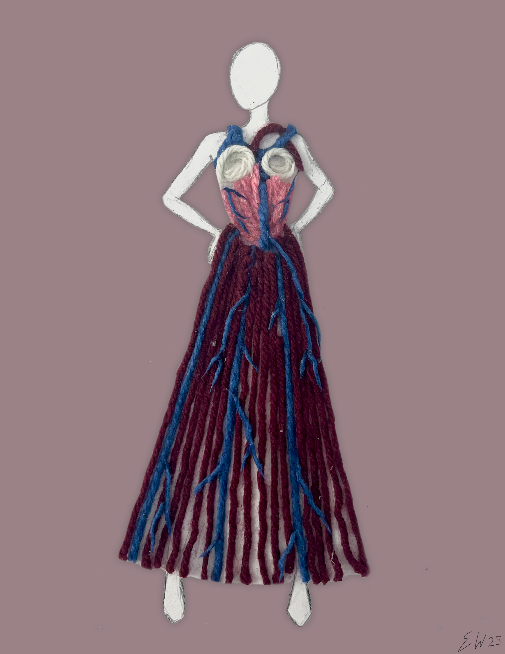 For this course we also had the opportunity to create some 3D fashion illustrations (unrelated to my capsule collection). This was my favorite piece I created, inspired by the human heart. It is yarn on paper, and I added a colorful background in Photoshop.