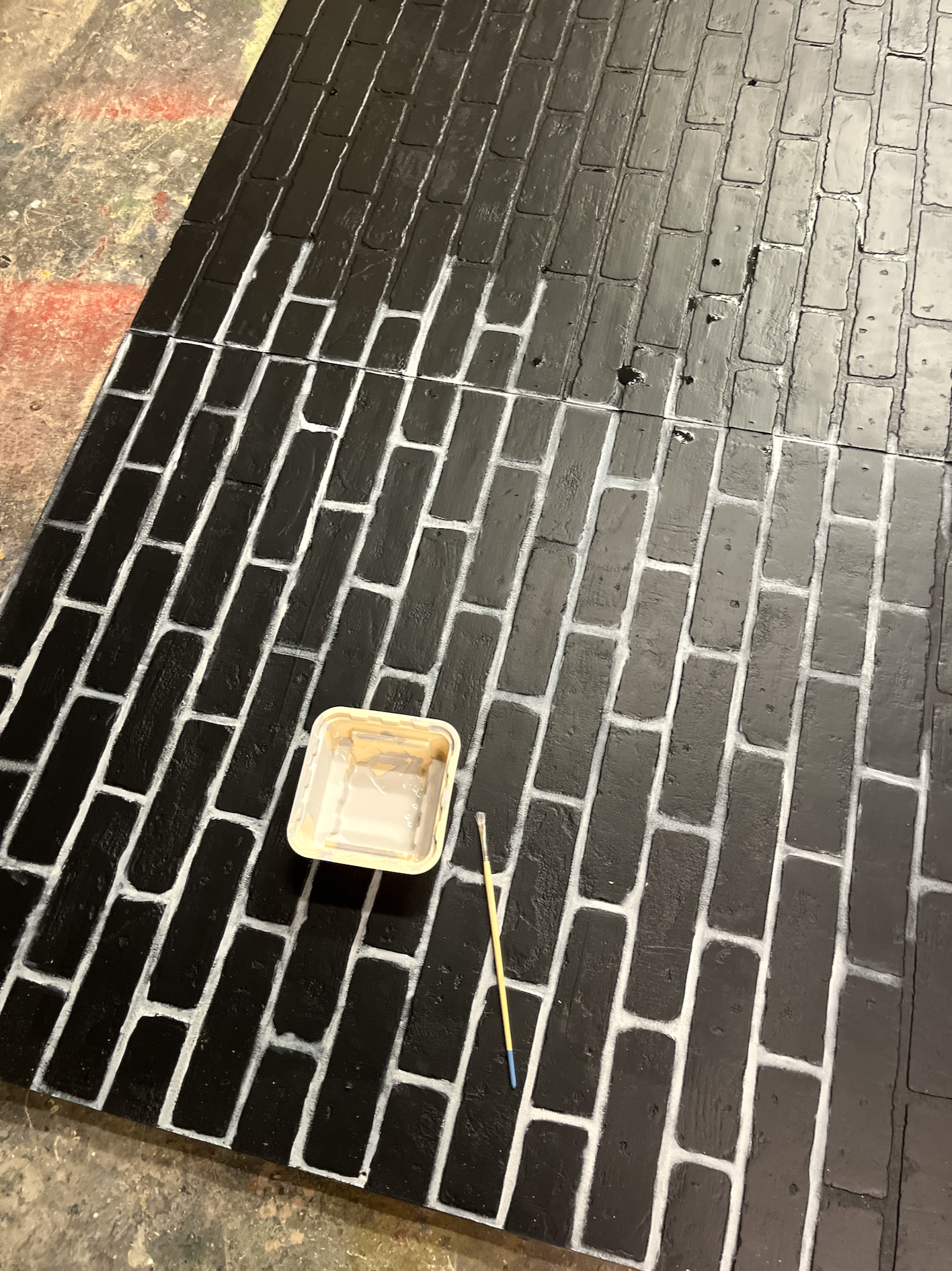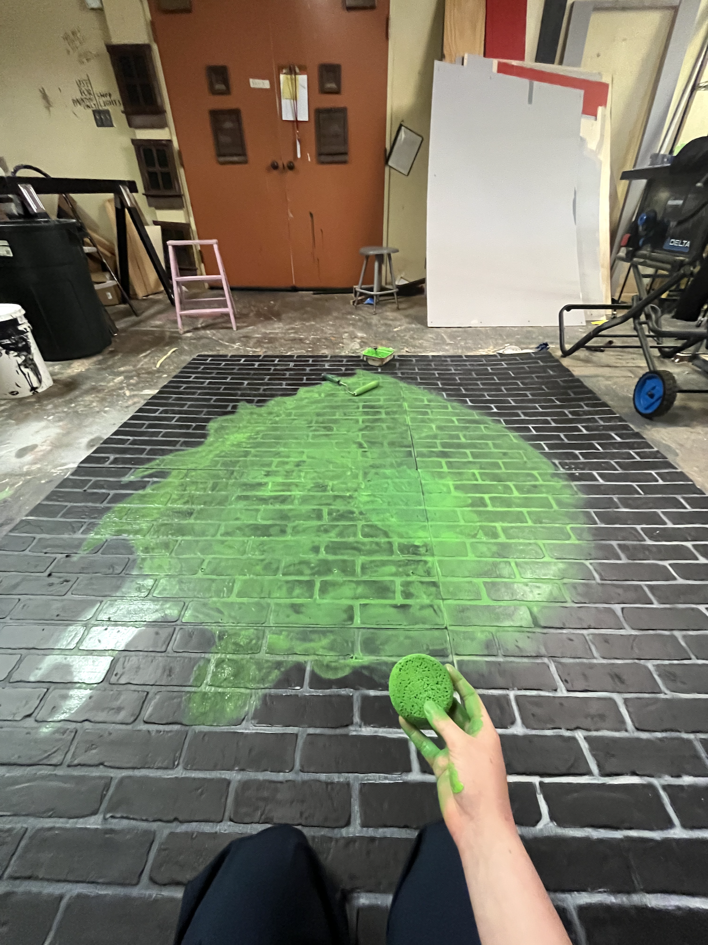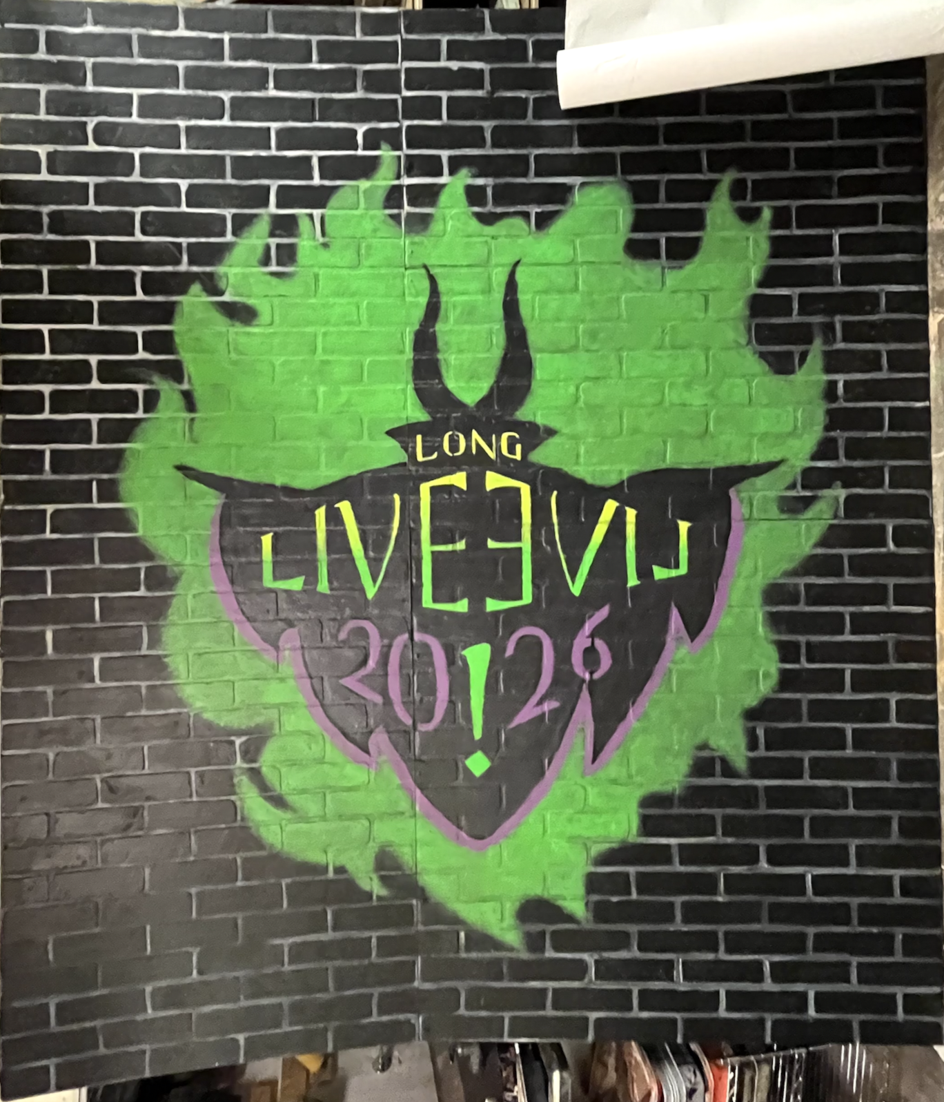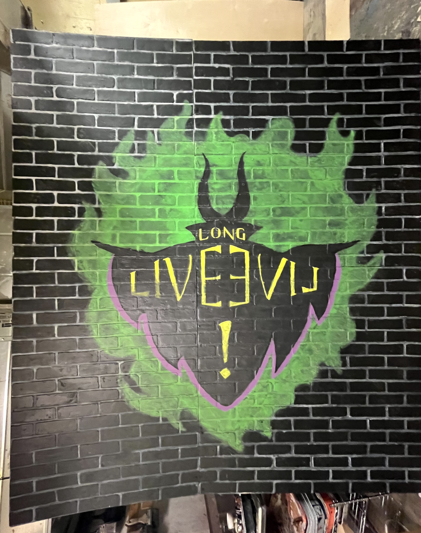 I painted this 7x8 foot sign for our Descendants themed junior rivalry! I used some brick textured boards that were in the theatre shop for the base. Our technical director helped me attach them all with a wooden frame, and my friends helped fill in some of the painted areas (especially the spaces between the bricks). It was supposed to mimic a spray painted sign from the movie, but being in a basement I figured that would be a tad hazardous, so I substituted with diluted paint and a sponge. Here are some process pictures: