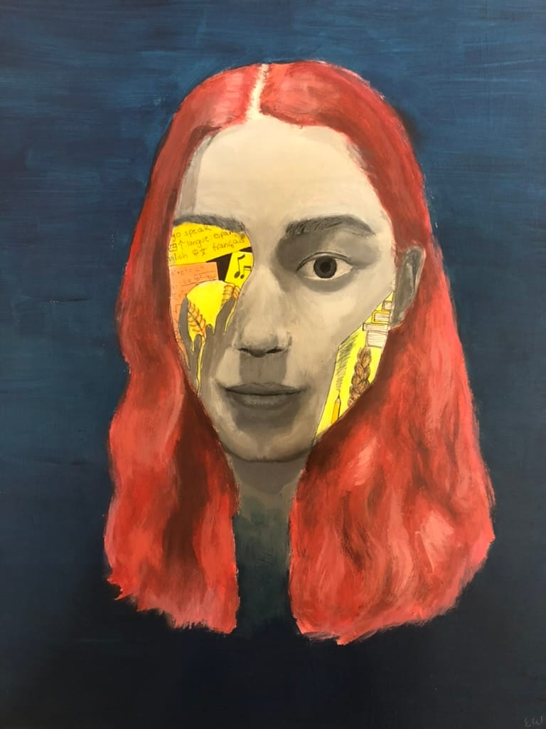 I painted this self portrait in my freshman year art class, and it was one of my first acrylic portraits using color. The assignment was to paint a portrait that represented us, so the cutouts in the face were meant to represent some of my interests.