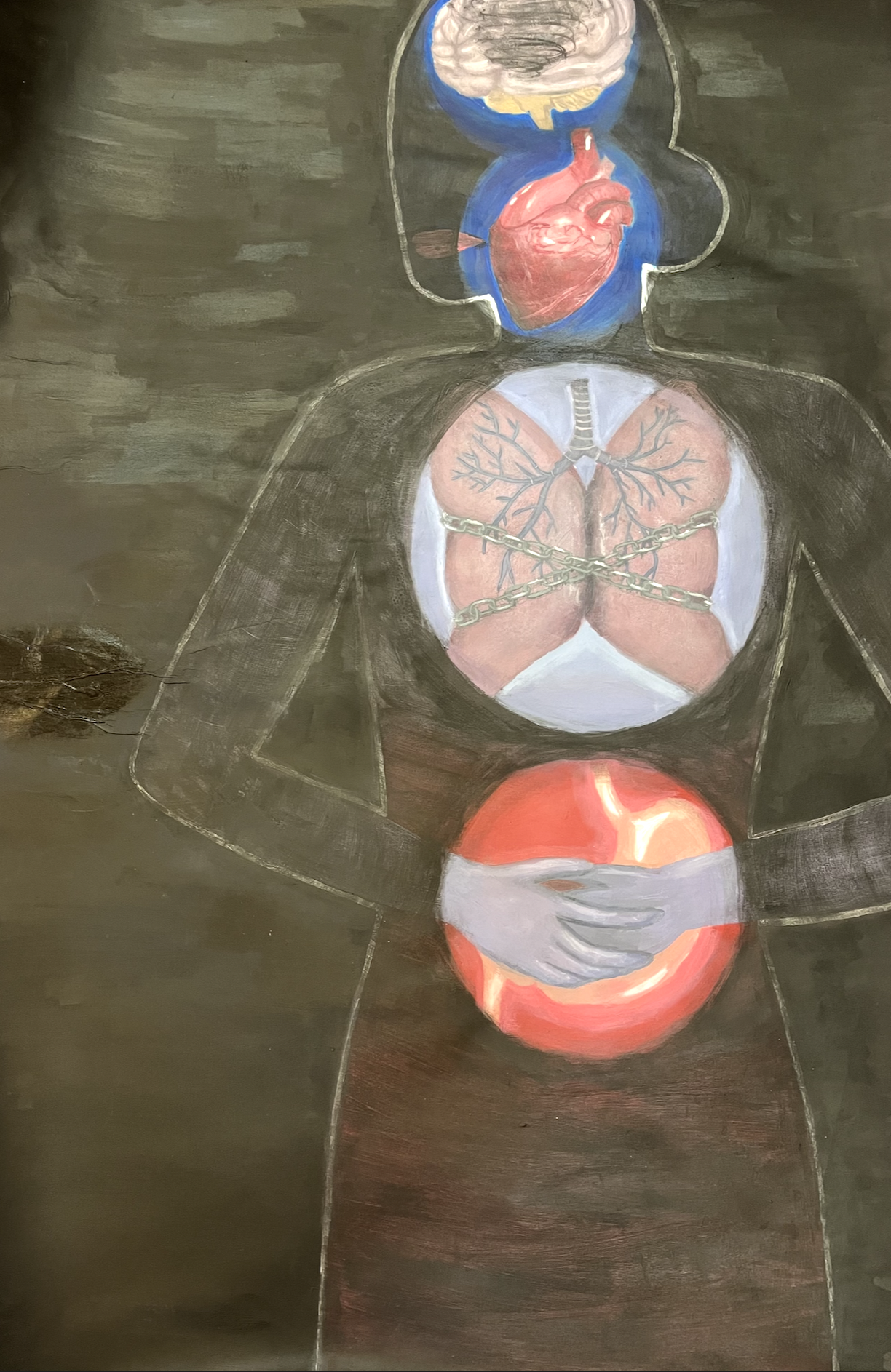 Another freshman year art assignment (December 2022, acrylics), this one required us to trace our outline and paint at least four body parts. I tried to get a little more creative and symbolic with this one, with the various spotlit organs representing my insecurities.