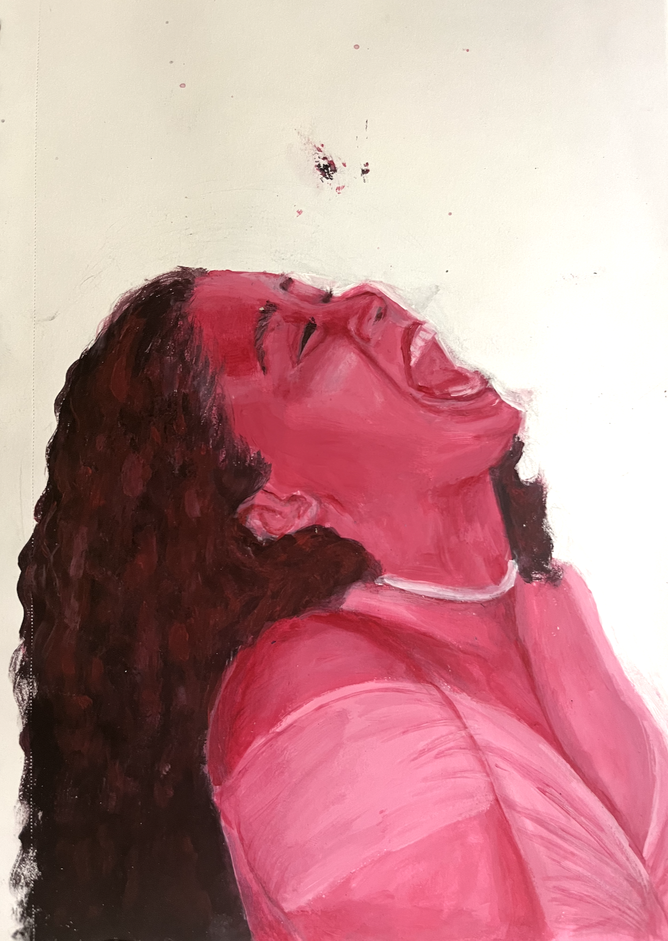 I went back to monochrome for this sketchbook painting (May 2023, acrylics) but this time in pink instead of grayscale. This was a fun challenge in capturing dramatic facial expressions, though the hardest part was definitely the hair—and I'm honestly still not entirely satisfied with the level of detail relative to the rest of the painting.