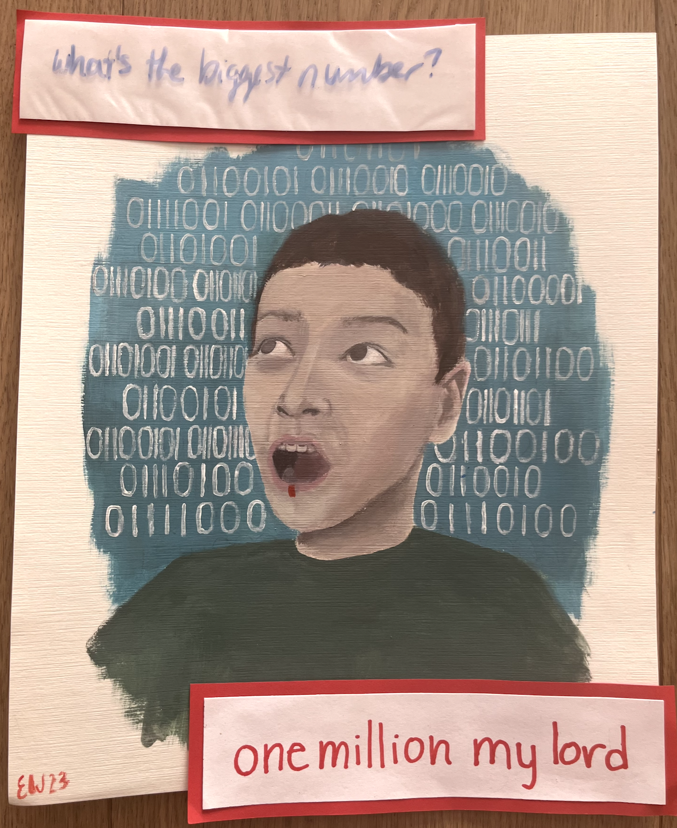 For this painting of my brother (December 2023, acrylics) I decided to just lean into the unnatural colors; the color scheme was meant to mimic a reference I found of a mentat in the new Dune movie (the text is a reference to a joke post about mentats).