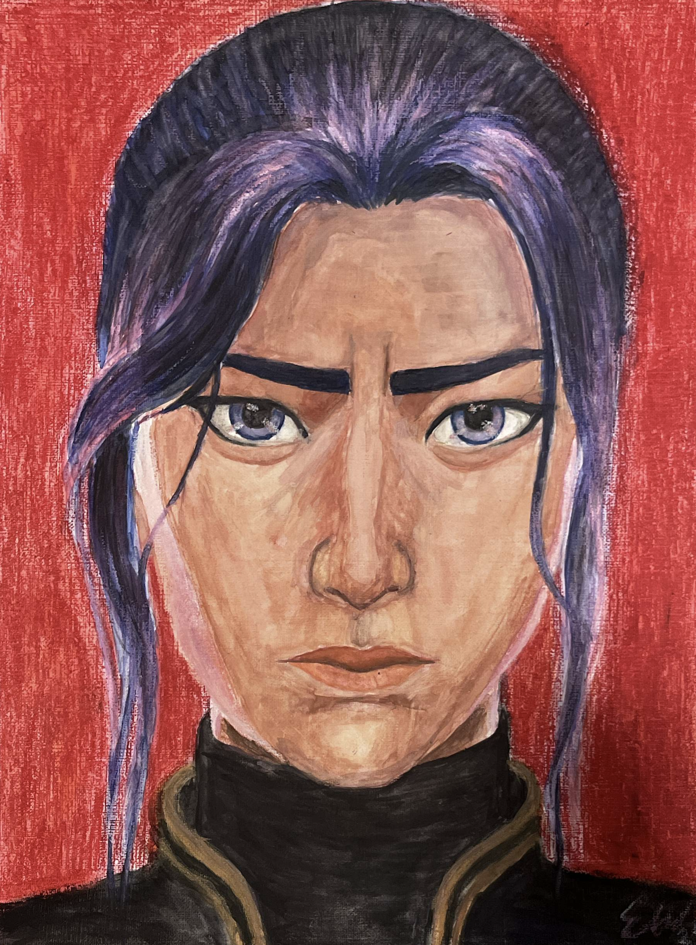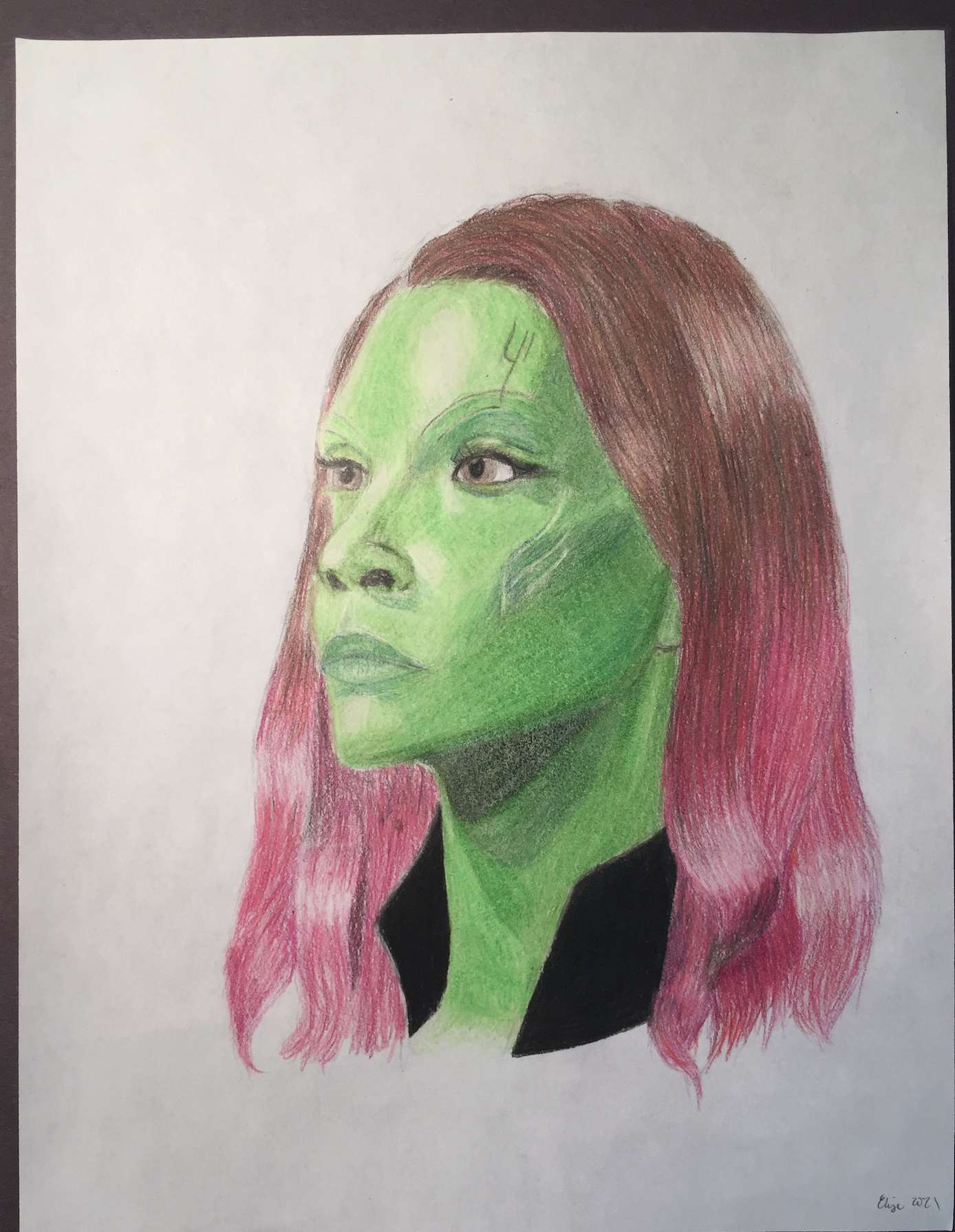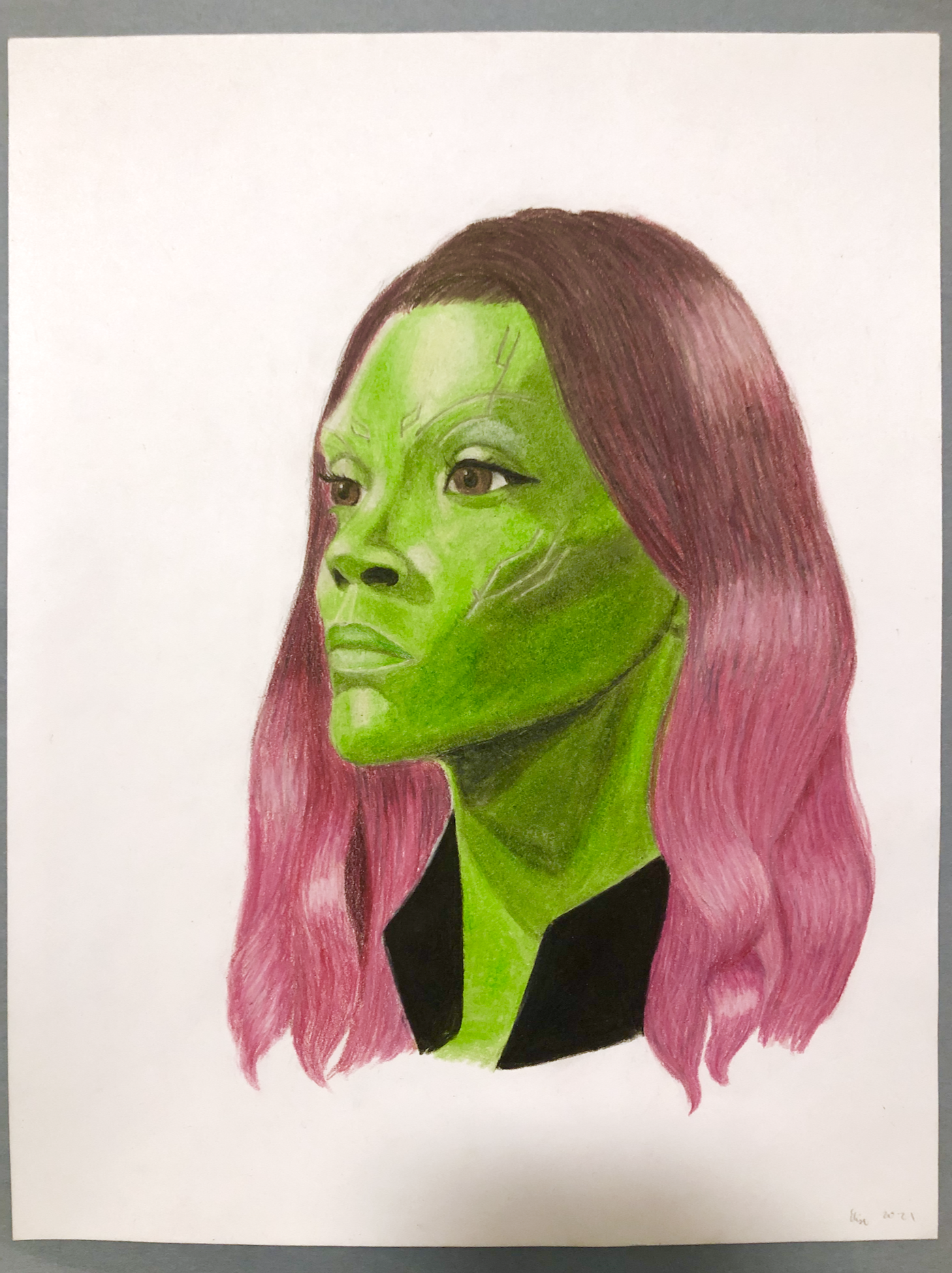 I started exploring other art mediums at the end of middle school, which led to these colored pencil portraits of Gamora (August 2021), from Guardians of the Galaxy. The left hand side was my first attempt, with basic Crayola pencils. I then invested in pencils that were easier to blend and improved the proportions for what I think was a much better second attempt. Though the final version is still one of my favorite portraits, I didn't love how permanent pencils were as a medium, so I haven't done many colored pencil portraits since.