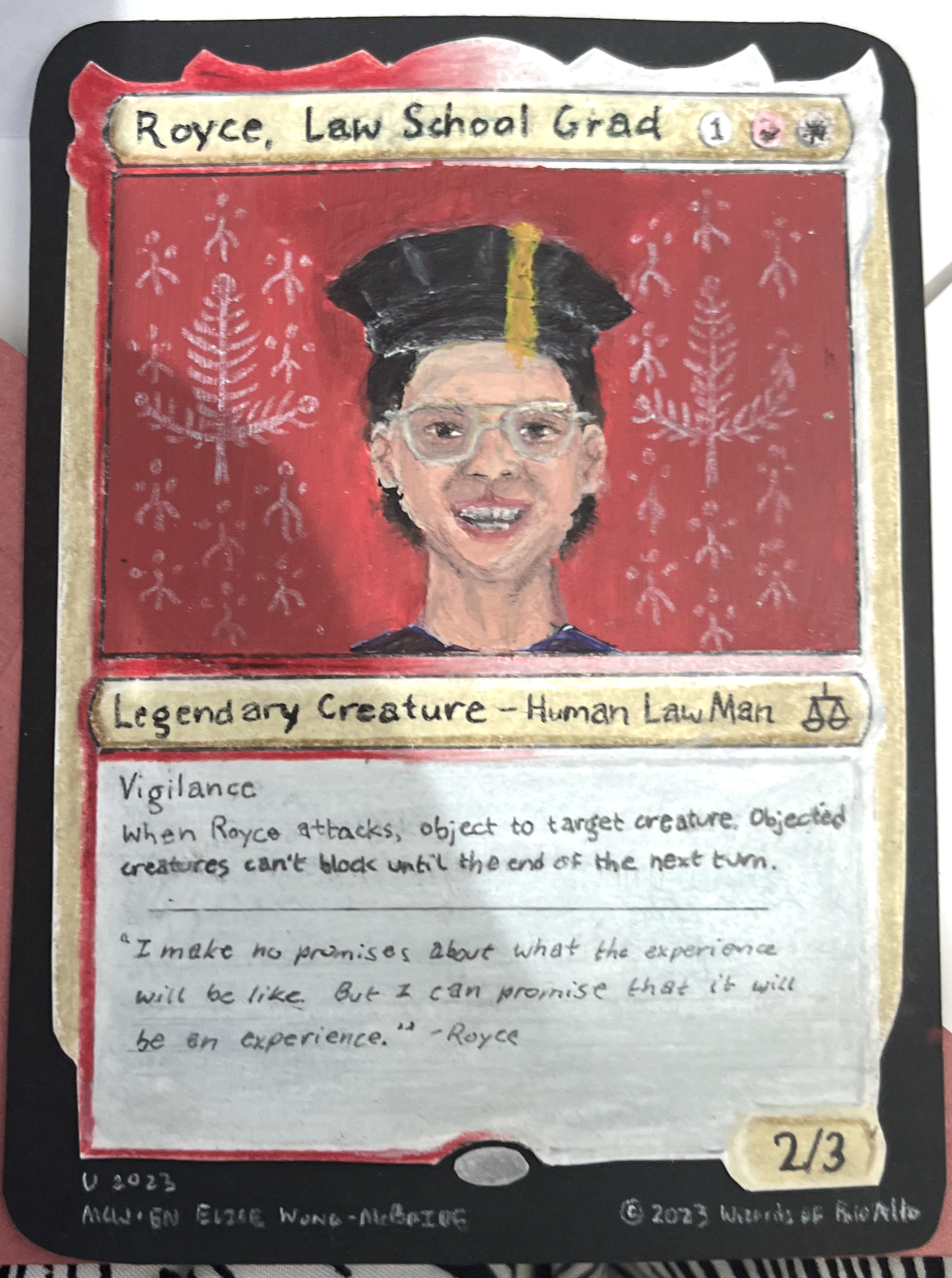 I painted this mock Magic the Gathering card for my cousin's law school graduation (June 2023). I'm not at all satisfied with how the face came out (working with something playing card sized was a struggle), but I still like the concept. The image is a mix of acrylic paint and colored pencil (for those tiny details), and the rest was colored pencil.