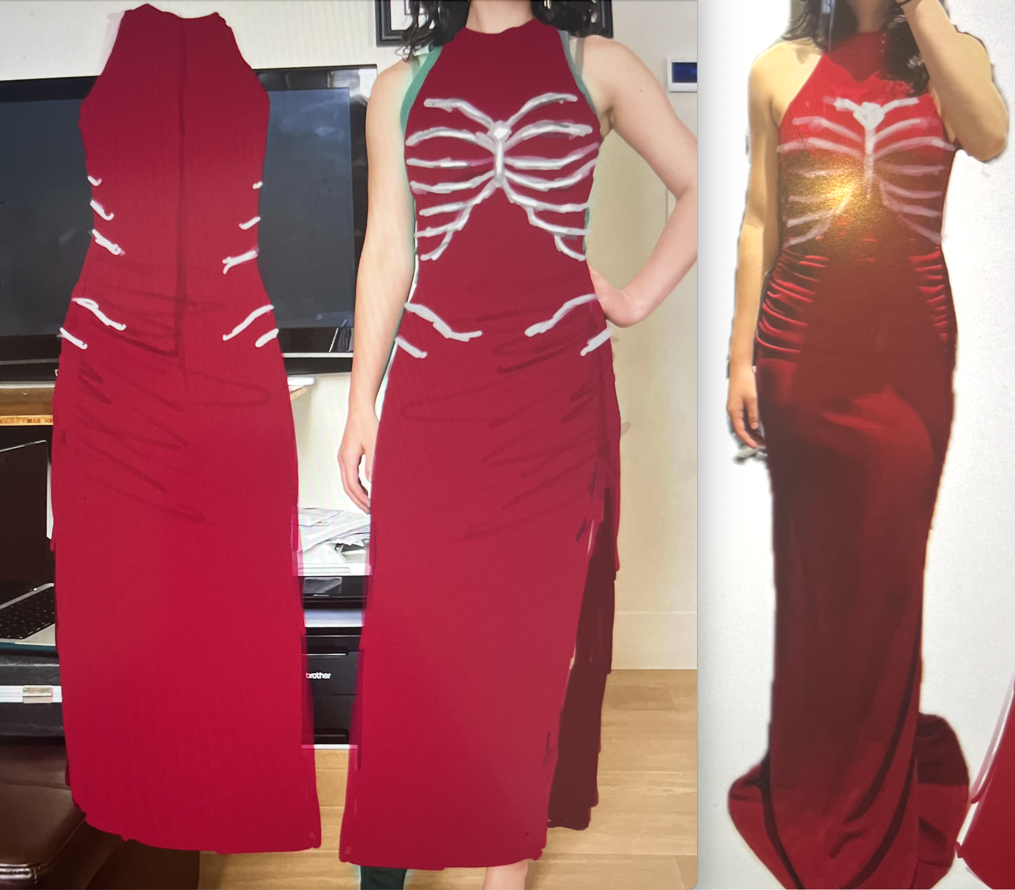 Lining up the magnets was tricky, but I found a method of putting on the dress and ribcage, aligning the magnet, taping it down, taping another magnet on the other side to hold it more securely, removing the tape on one side, and carefully sewing around that primary magnet.